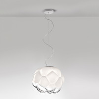Cloudy is a designer ceiling light featuring a diffuser with a particular shape reminiscent of clouds. Hence the name. The diffuser, handcrafted, is in white blown glass that fades towards transparent at its lower end. This is a ceiling light suitable for both modern and classic environments. It distributes a good uniform light across the space and can perfectly illuminate the whole room. Available in two different sizes: large or small.