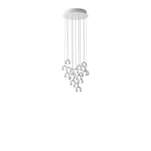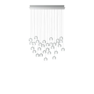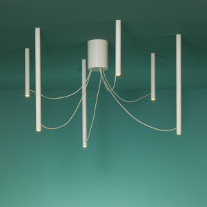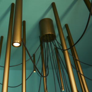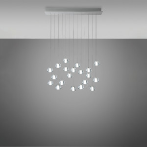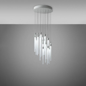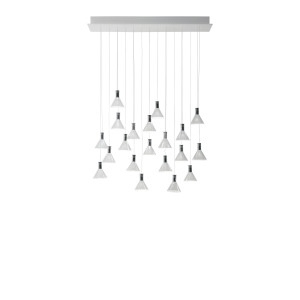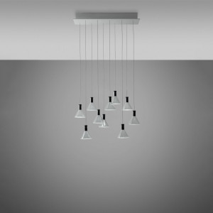 Multispot is a collection of modern chandeliers that differ from each other in the shape of the diffuser. Beluga, Polair and Tooby are the three versions available. The first with a round glass diffuser, Polair features conical diffusers in transparent glass, sandblasted at the bottom, while Tooby features a matt white glass diffuser with a cylindrical and elongated shape. All three versions can be chosen in different sizes with one or more light points and structure in different finishes, anodised or coppered aluminium, black and copper. With the ability to choose between a round or rectangular rosette, Multispot adapts to any environment, be it domestic: living rooms, bedrooms or dining rooms, or contract: such as restaurants or in a reception, for a definitely scenic effect.