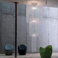 Giogali is a design chandelier in glam style. The name of this suspension lamp comes from the Venetian word used to indicate the lace that binds the cart to the yoke. It is characterized by the diffuser composed of a chrome metal structure around which numerous crystal hooks are assembled. The combination of these elements creates crystal chains that are joined together to create ever-changing decorative compositions. Giogali is offered in various models, shapes and sizes to be used in small or large rooms.