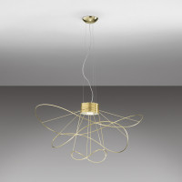 Hoops is a designer chandelier with a recognisable style and shape that will not go unnoticed. Composed of interchangeable elements of different shapes and sizes. Thin metal rod wires seem to dance around the central core where the LED light source resides, allowing uplight and downlight illumination. Ideal for lighting domestic spaces such as living rooms, bedrooms or corridors, but also commercial spaces with a refined style. Available in gold finish and in a version with 2, 3, 4 or 6 circular elements.