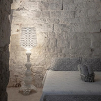 Kabuki is a modern floor lamp made with a particular perforated weave technique inspired by the motifs of a hand-embroidered lace. Available in many finishes, this floor lamp has been designed to be used also in the outdoor space as furniture for a garden area with sofas, or to decorate a swimming pool area. The diffusion of light occurs indirectly thanks also to the type of diffuser, which gives it special scenographies; ideal for summer contexts.