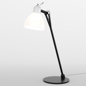 collection of table, floor, wall and hanging lamps, inspired by technical lighting equipment with pivot arms. The movement is made possible by torsion springs hidden in the joints. The glass diffuser is coated with color paint.