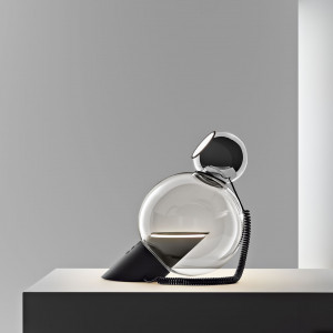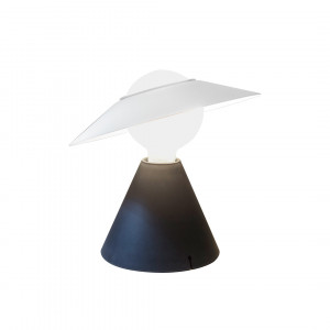 Fante, available in table and ceiling versions, stands out for its pure geometries. It is composed of a molded cone trunk in rubber and a glass sphere with a white painted aluminum shade that can be oriented as desired.