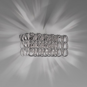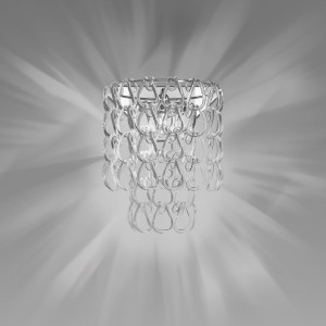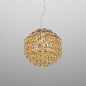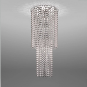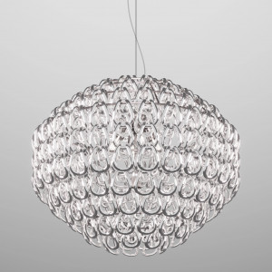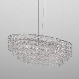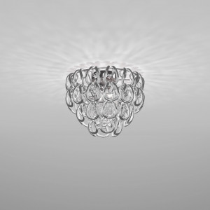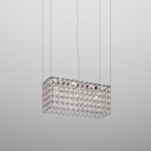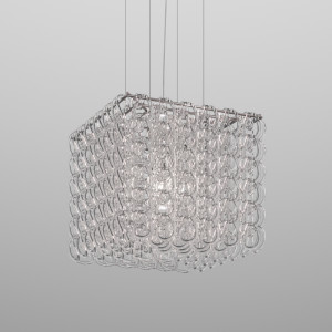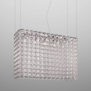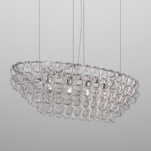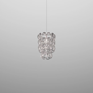 Giogali includes design lamps designed to be a decorative lighting system based on a single modular component. It is a crystal hook that, attached to a metal structure, forms the diffuser of all the various models in the collection. This system was designed by designer Angelo Mangiarotti and allows the creation of structures of any size from the smallest to the largest. Even in terms of shapes and color finishes the possibilities are varied. Suspended and ceiling / wall lamps can be created in square, rectangular, cascade or round shape. Also available in table and floor versions. The Giogali 3D version, on the other hand, allows the creation of an extensible mesh structure both vertically and horizontally. Minigiogali is the line of lamps with smaller dimensions compared to the original version, proposed in various types and suitable for residential contexts. The design of these lamps has been awarded, protected by a patent and has obtained important international awards.