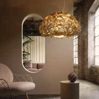Quantica è un lampadario moderno ispirato al concetto di "entanglement quantistico", un fenomeno affascinante che descrive l'interconnessione di tutti gli elementi dell'universo. Ogni elemento del lampadario dialoga con la luce, dando vita a una scultura densa e lussureggiante che illumina gli spazi residenziali e ricettivi con stile e raffinatezza. Ciò che rende Quantica veramente sorprendente è la sua trama dorata. Questo effetto straordinario è ottenuto grazie a una lamina applicata sull'Opalflex®, un tecnopolimero infrangibile lavorato a freddo e allestito a mano.